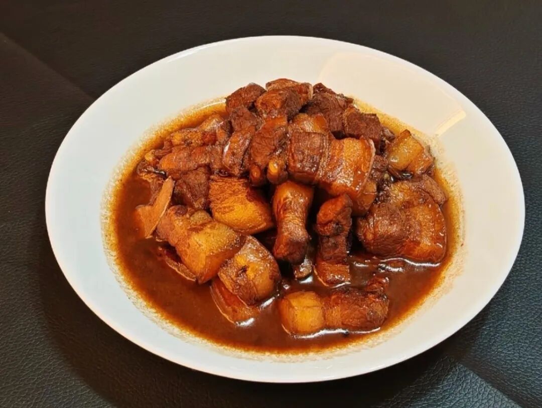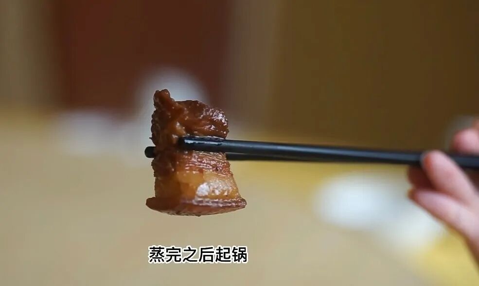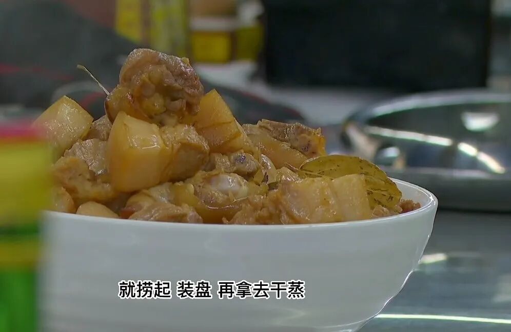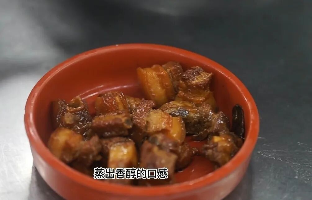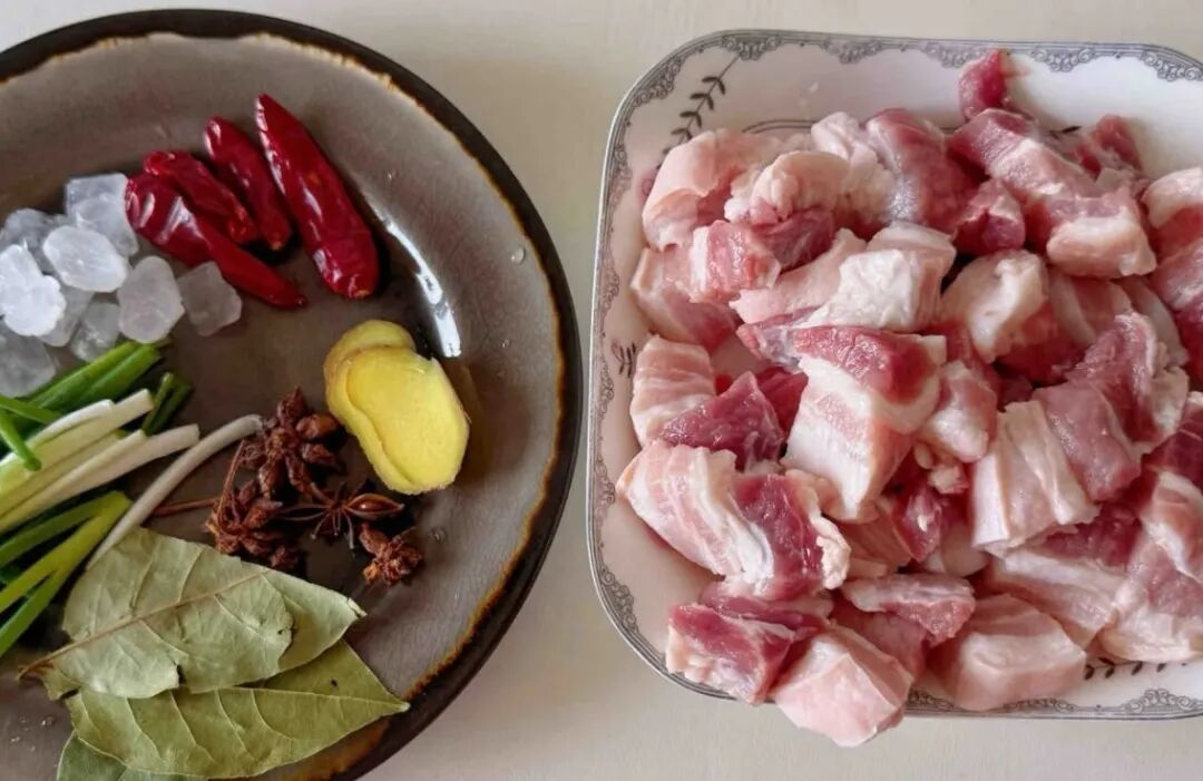 先将自宰或者购买的“一刀落”猪肉,连皮带骨,切成方块,每块约一二两重;随后放到滚水泡一下,捞起过冷水,增其爽口的口感;再把过好冷水的猪肉放到锅里加上油、盐、冰糖、八角粉、香叶、小回味料一起炒,猪肉大约5成熟就用盆子装好放到大锅里面。大锅里不可以放水,慢火干蒸;蒸到最后大锅会烧成火焰红色,约一个小时就可以吃了。