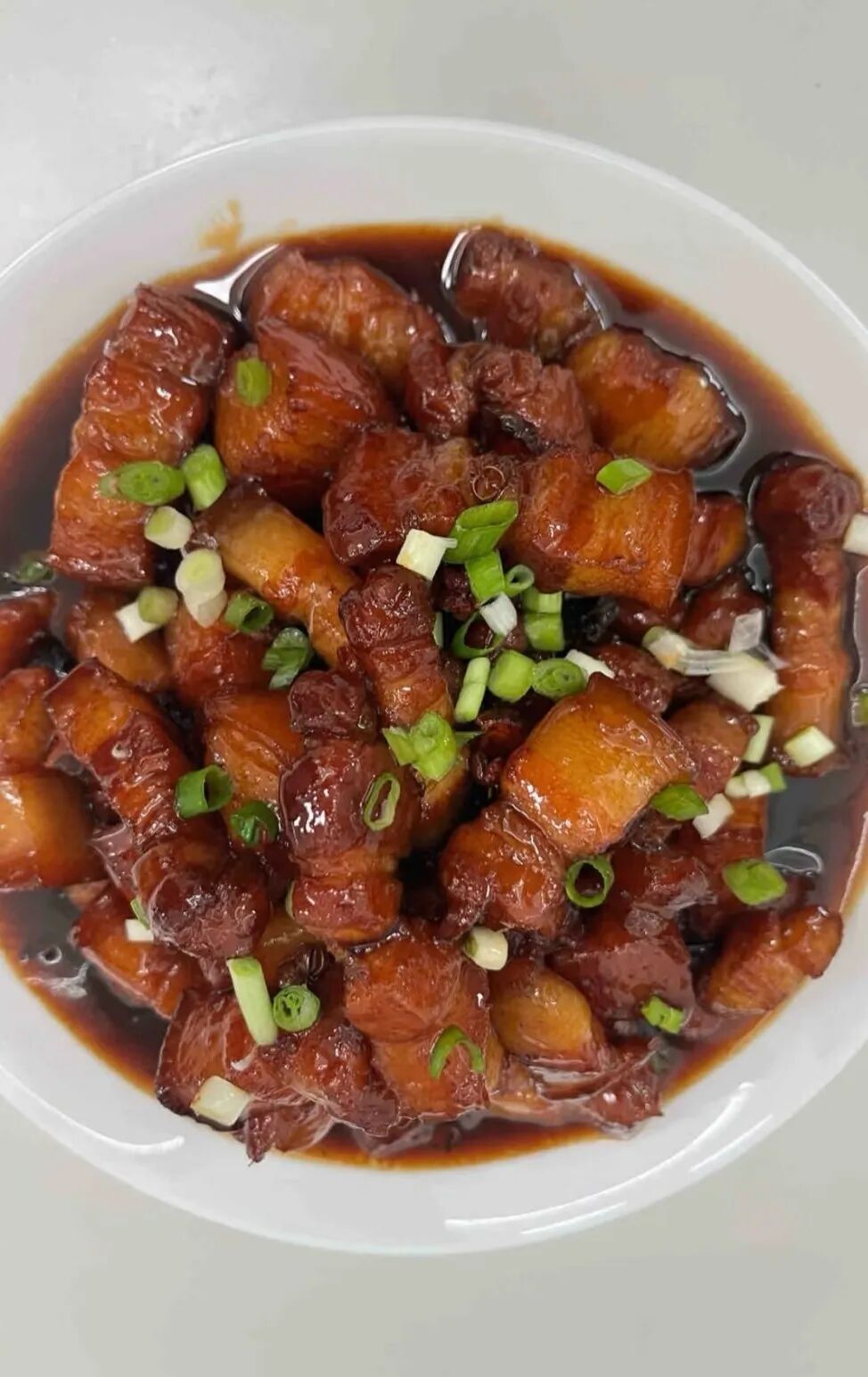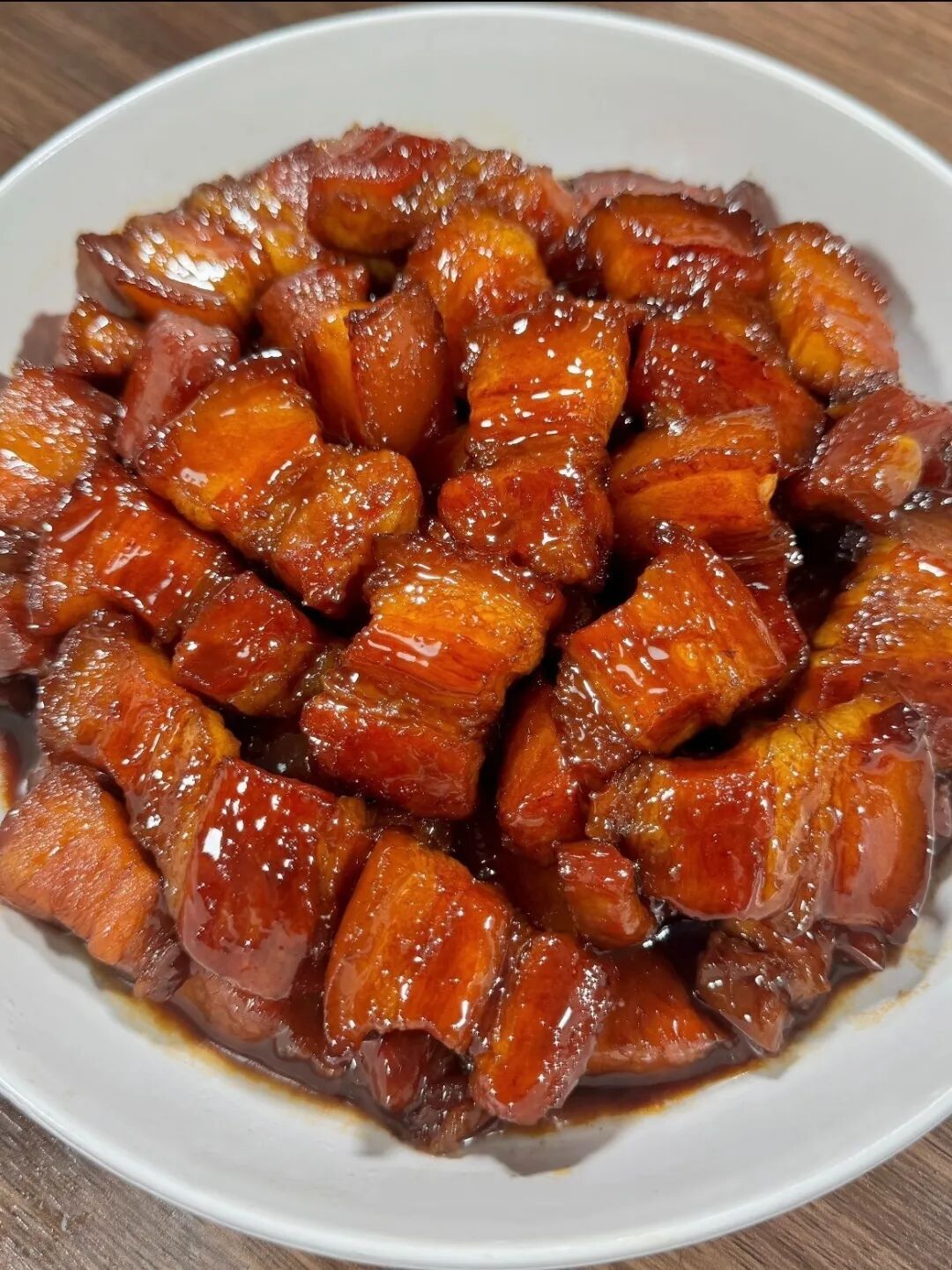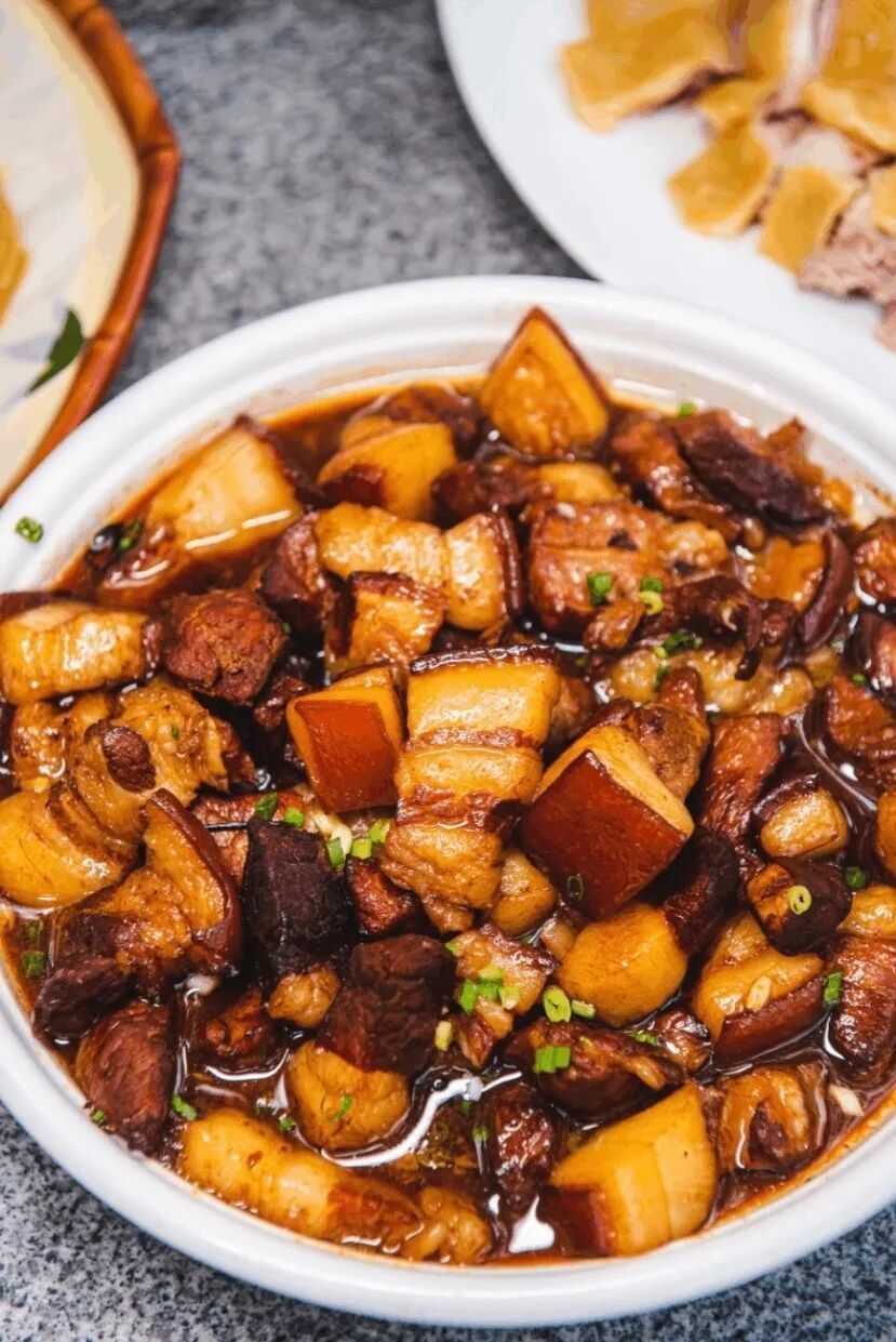 先将自宰或者购买的“一刀落”猪肉,连皮带骨,切成方块,每块约一二两重;随后放到滚水泡一下,捞起过冷水,增其爽口的口感;再把过好冷水的猪肉放到锅里加上油、盐、冰糖、八角粉、香叶、小回味料一起炒,猪肉大约5成熟就用盆子装好放到大锅里面。大锅里不可以放水,慢火干蒸;蒸到最后大锅会烧成火焰红色,约一个小时就可以吃了。